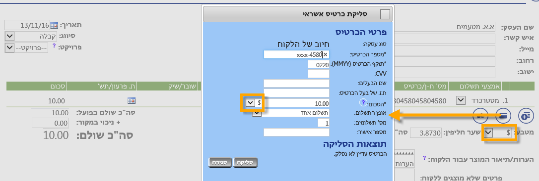 | אופן התשלום: | אתה יגול לסלוק בתשלום אחד, במספר תשלומים ללא ריבית (כלומר חברת האשראי לא גובה ריבית מהלקוח שלך) או בקרדיט שהם תשלומים עם ריבית. בכדי לסלוק בקרדיט עליך לחתום הסכם מתאים עם חברת האשראי שלך. | |