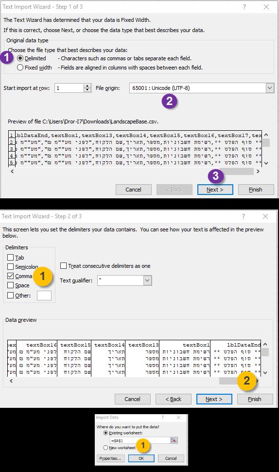 4. במסך הבא לבחור ב-Delimited, לוודא שהקידוד הוא 65001, ואז להקליק Next