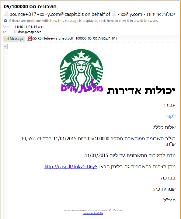 הנה דוגמה למייל שנשלח מכספית. גודל הלוגו הוא 150 על 150 פיקסלים.