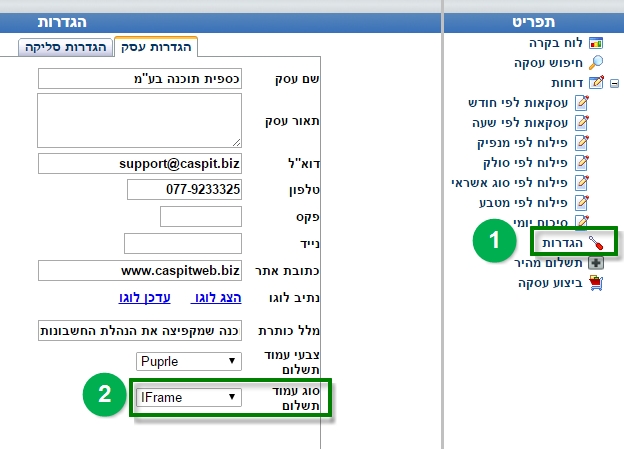 - חש/קבלה - לאחר התשלום כספית תיצור חש/קבלה ותשלח אותה ללקוח. הלקוח יוכל לשלם בתשלומים. מספר התשלומים המירבי נקבע בשדה מספר תשלומים מירבי.